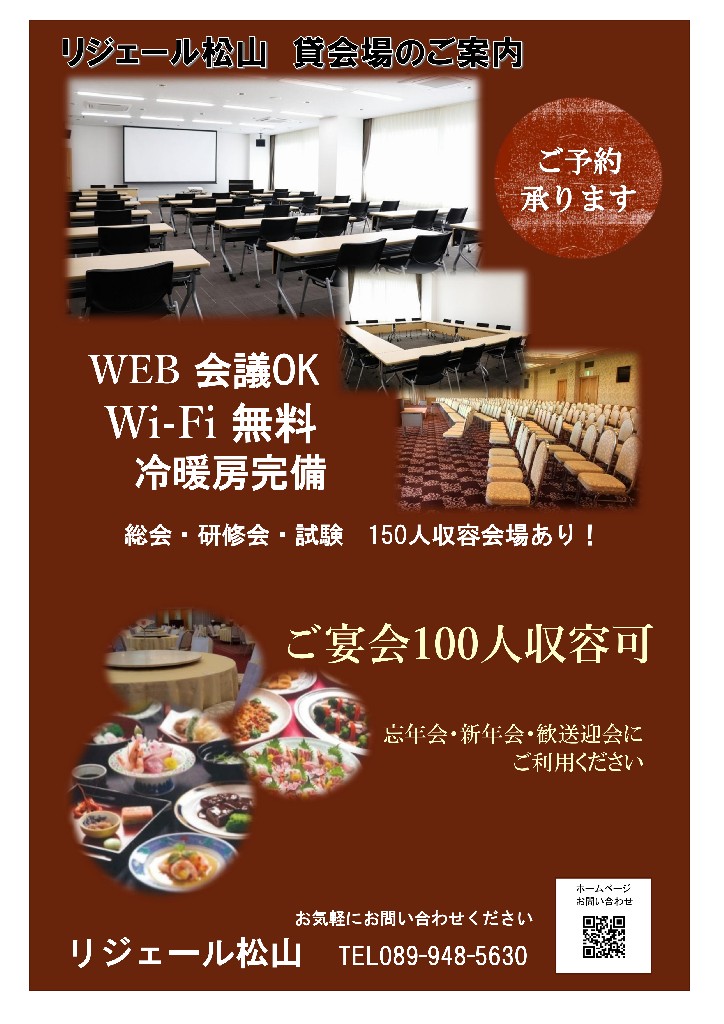 貸しホール大規模 会議(研修会)ご宴会 承ります!! 大規模 会議(研修会)ご宴会 承ります!! 2025年10月29日 貸しホール 会議・研修会・総会・ご宴会 にご利用ください ★会議とご宴会のセット承ります★ ■松山城を臨む絶好のロケーション会場あり! ■Wi-Fi利用が無料!! ■交通アクセス良し! ご予約お待ちしております https://www.riziere.jp/hole/ ← 屋上ビアガーデン今シーズンの営業を終了いたしました